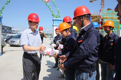 【本报讯】8月12日,宁波市住建委主任郑世海到PA视讯集团网站建乐分公司负责施工的职工之家项目部,慰问奋战在高温一线的建设者,向一线施工人员送上了矿泉水、毛巾、沐浴露、藿香正气水、人丹等防暑物品。
