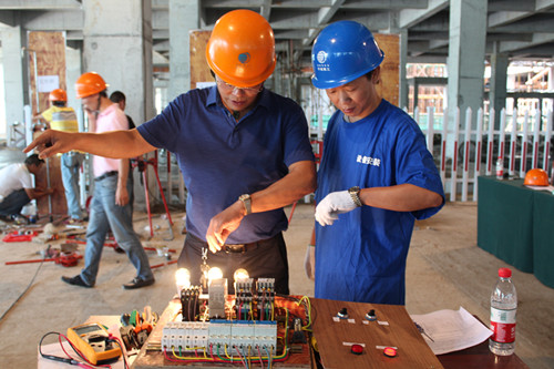 比赛设在宁波职工之家工地,号令下发后,参赛人员飞速跑到预定地点,管子钳、手工绞板、电工刀、尖嘴钳等一一用上,试压泵、万用表、测试、读数、记录,技术要领一气呵成,参赛人员你争我赶,现场比武忙碌有序。