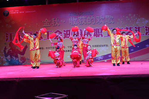 9月21日19:00,由江东区总工会主办的露天迎国庆职工文艺汇演在东部新城文化广场的剧院广场如期举行。晚会由激情澎湃的鼓舞拉开序幕,随后《春暖花开》、《相亲相爱》、《五星红旗》等八个精彩歌舞一一登场。精彩的节目引来百名群众观看,不时爆发出阵阵掌声。活动最后是由设备安装公司带来的压轴群舞《红红的日子》,职工们的柔情与奔放的倾情演绎不仅把整台演出推向了高潮,更是将公司健康、和谐、向上的精神面貌充分展现在观众面前。