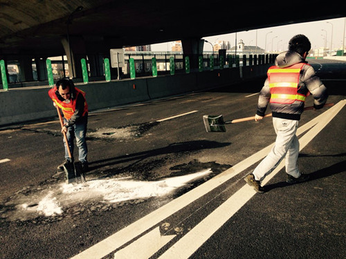 图为市政集团杭甬互通立交工程项目部员工正在清除路面冰冻