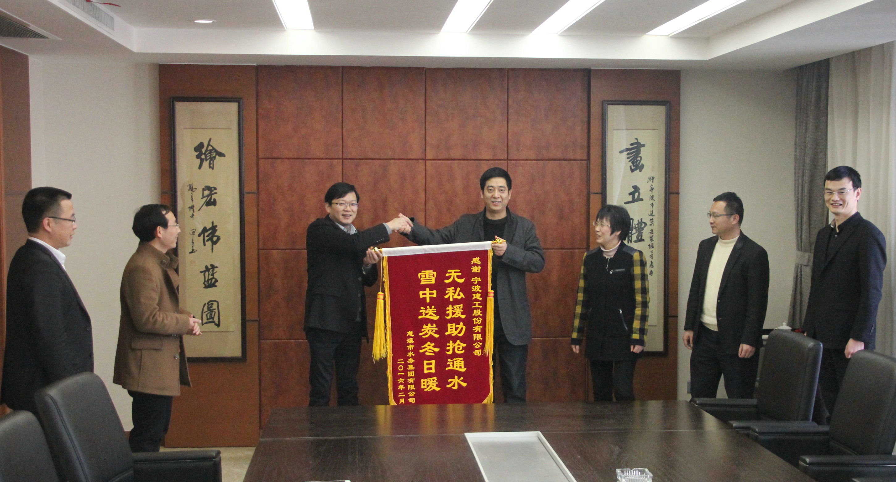 会后,翁海勇代表建工集团接受了慈溪市水务集团赠送的锦旗。