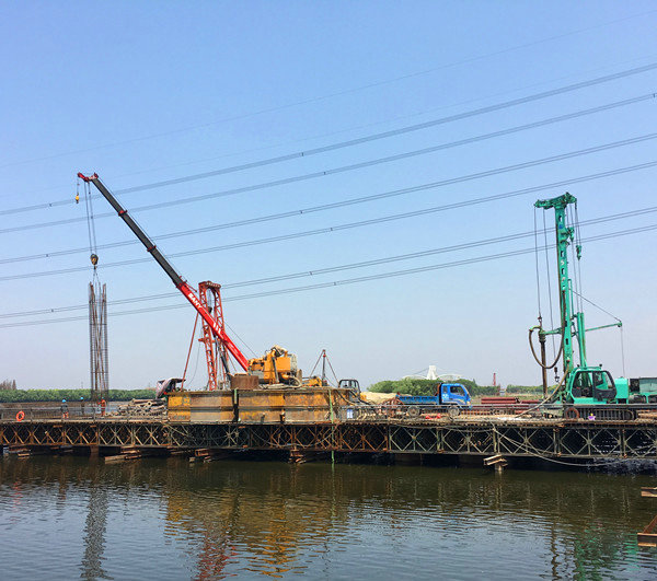 由宁波市政集团承建的宁波杭州湾新区三座跨江桥(包括兴慈八路桥、滨海大道桥、滨海五路桥)工程是连接杭州湾新区商务新城区和工业区块的重要节点工程,项目自2月28日正式开工以来,目前该项目水上栈桥、水上钻孔平台等临时结构已实施完成,累计已完成产值约2870万元。其中,滨海大道桥和兴慈八路桥已进入水上主墩桩基施工阶段,计划7月份完成三桥水中主墩桩基。