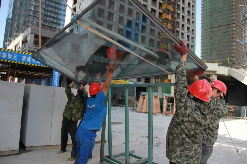 东部新城C1-7工程装修火热进行中,预计2015年初竣工。图为施工人员正在搬运幕墙材料。
